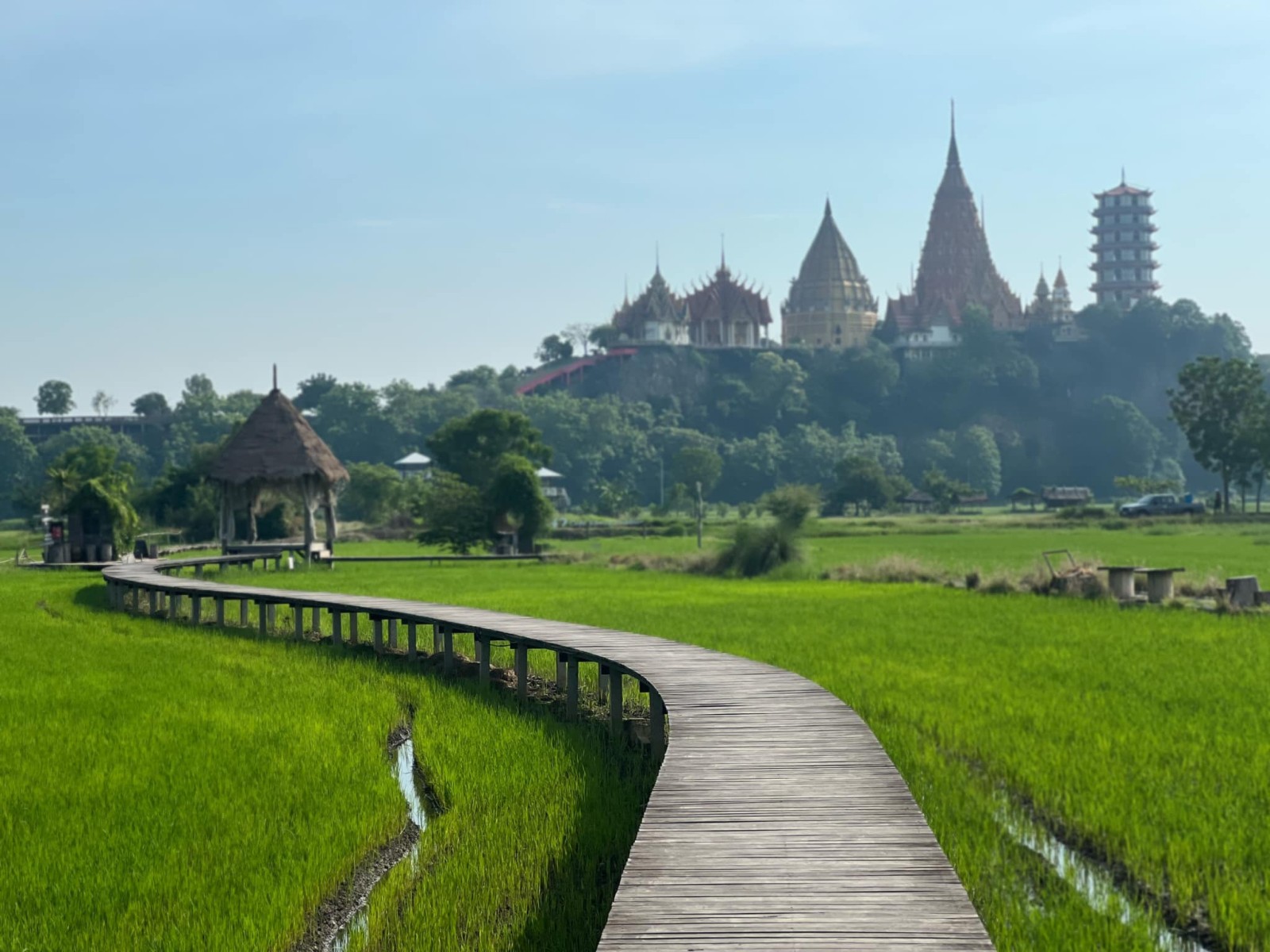 บรรยากาศ เป็นคาเฟ่กลางนาที่ใหญ่ พื้นที่กว้างข้าง ยิ่งช่วงที่นาเขียวขจี เวลาข้าวออกรวงเป็นสีเหลืองก็สวยไปอีกแบบ สดใสสวยงาม ยิ่งมีสะพานทางเดินยื่นยาวลงทุ่งนายิ่งรู้สึกได้ใกล้ชิดกับธรรมชาติ บางช่วงก็จะเป็นทุ่งดอกปอเทื่องสลับกันไปนะ (ทางเพจเขามีการอัปเดตวิวปัจจุบันด้วยนะ ลิงค์เพจอยู่ด้านล่างเลย) ร้านอยู่หลังวัดถ้ำเสือ บรรยากาศดีมาก มีมุมถ่ายรูปเยอะ ถ้าช่วงค่ำจะได้วิวพระอาทิตย์ตกแสงสวย ถือเป็นโลเคชั่นการเช็คอิน ถ่ายภาพต่าง ๆ ตอบโจทย์ได้ดีเลย ส่วนที่นั่งทางร้านก็จัดให้ทั้งห้องแอร์ และ Outdoor รวมถึงที่นั่งแบบ ชิลล์ ๆ จะนั่งเล่น นอนเล่น ใครมาวัดถ้ำเสือควรแวะจ้าาาา